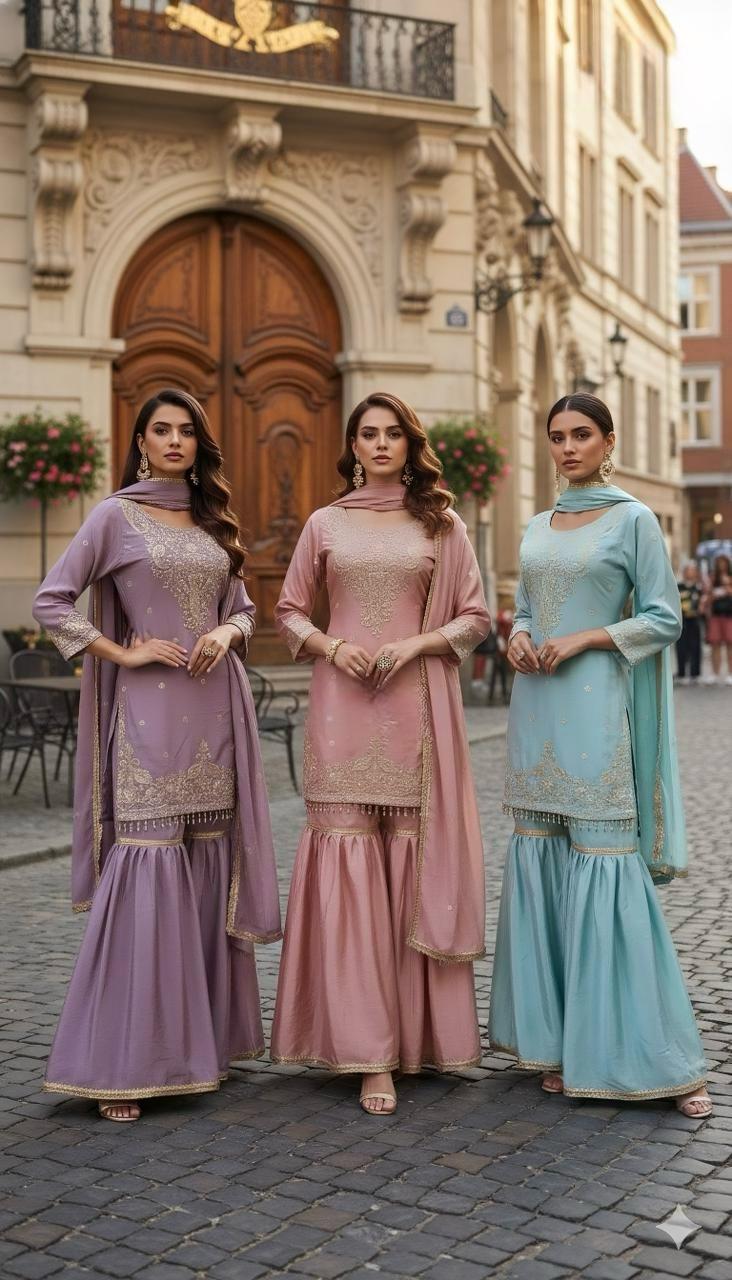 Intricate Tilla/Zari Embroidery detailing with subtle sequin accents.The chic, flowing Sharara Pants paired with a straight Kurta and matching Dupatta create a regal and flattering profile.